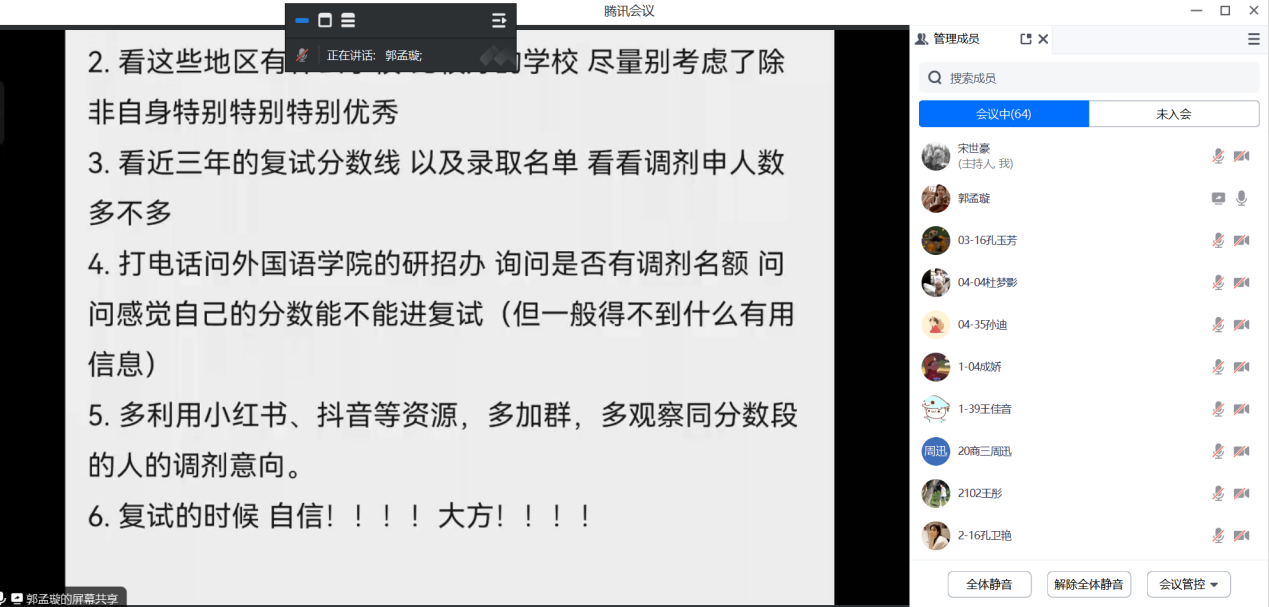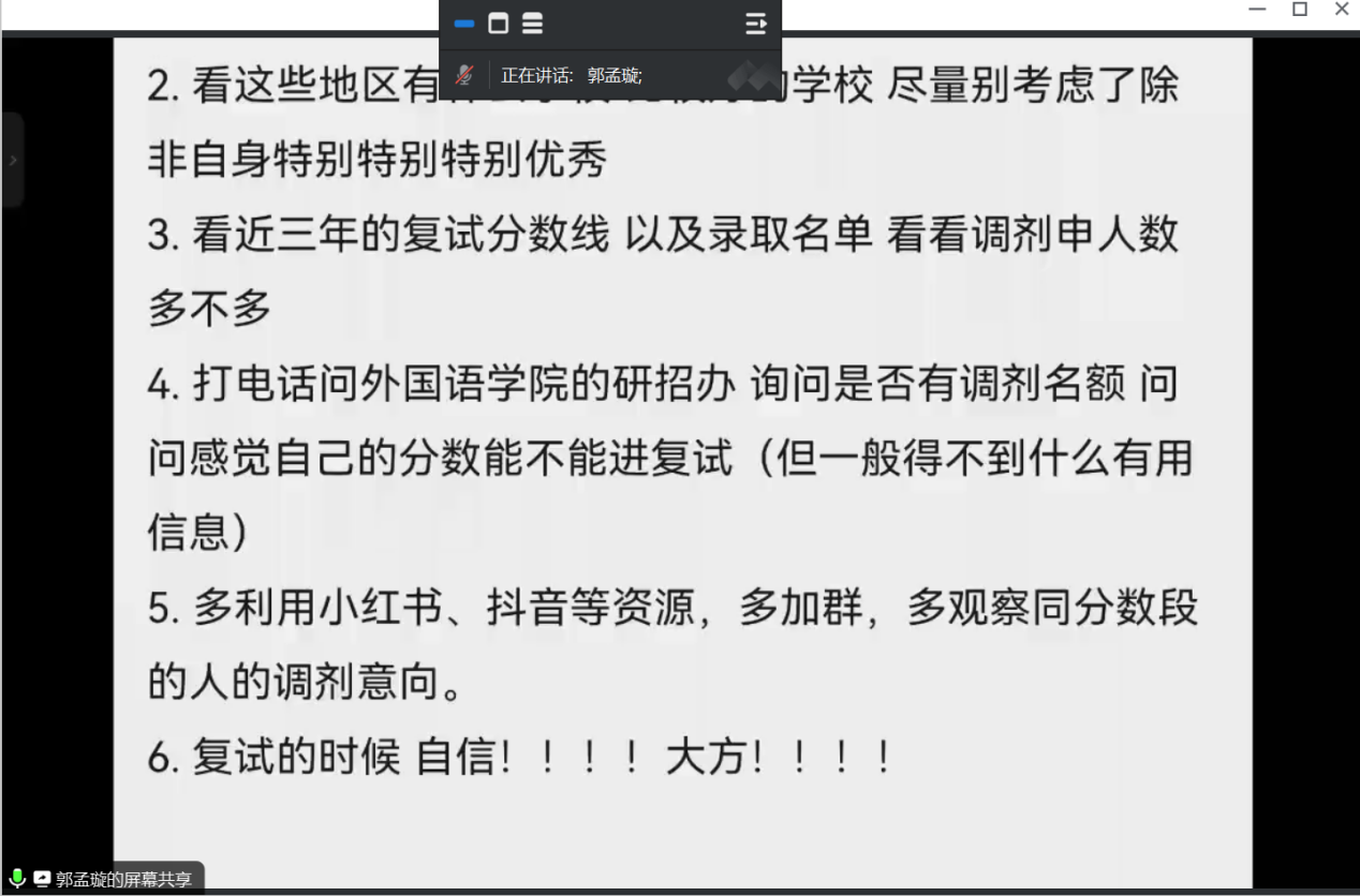 本次分享会之前,学院已组织一次模拟复试,并根据模拟情况,组织专业老师对相关学生的复试情况进行分析,建立台账。对有必要进行调剂的学生,针对其报考专业分析研判相关调剂信息,并给学生以具体指导; 与此同时, 学院充分调动往届考研上岸学生资源,根据本届学生考研实际,把分享会分为复试经验分享、调剂经验分享和留学深造经验分享三个板块,力求照顾到多样化的学生诉求。在分享过程中,往届上岸学生倾囊相授,从英文自我介绍、专业基础知识问答、专业综合素质测评等各个环节进行了经验分享,尤其是针对考研调剂的各个环节,上岸学生都从自身经历出发,生动形象的给出详细建议。在最后的互动环节,不同届的外语学子畅谈考研心得和分享学习经历,互问互答,气氛热烈。轻松、热情并详实的交流使本届考研学生倍感温暖,充满信心。