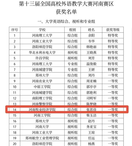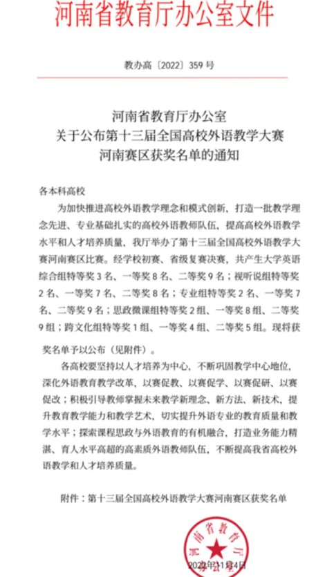 近日,河南省教育厅下发《河南省教育厅办公室关于公布第十三届全国高校外语教学大赛河南赛区获奖名单的通知》(教办高〔2022〕359号),伟德源自英国始于1946李曦团队荣获思政微课组特等奖,张思佳荣获大学英语综合组一等奖,丁玮荣获英语专业组二等奖。