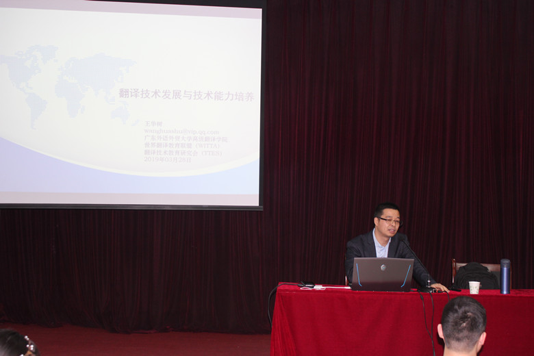 陈院长在欢迎辞中首先简要介绍了王博士的学习和工作经历,王博士在专业领域里的丰硕研究成果反映出了王博士出众的能力水平、学术成就。王华树博士从个人的从业经历开始,与在座师生分享了自己在翻译技术领域的一路探索。然后王博士从翻译技术的概念、分类谈起,着重从技术驱动的服务变革、现代翻译技术发展及趋势,翻译技术与翻译能力之间的关系,以及如何正确认识人类与技术的辩证关系,新一代语言服务人才基本能力的构成,生动且严谨地阐述了翻译技术能力构建与培养的重要性及核心要素。