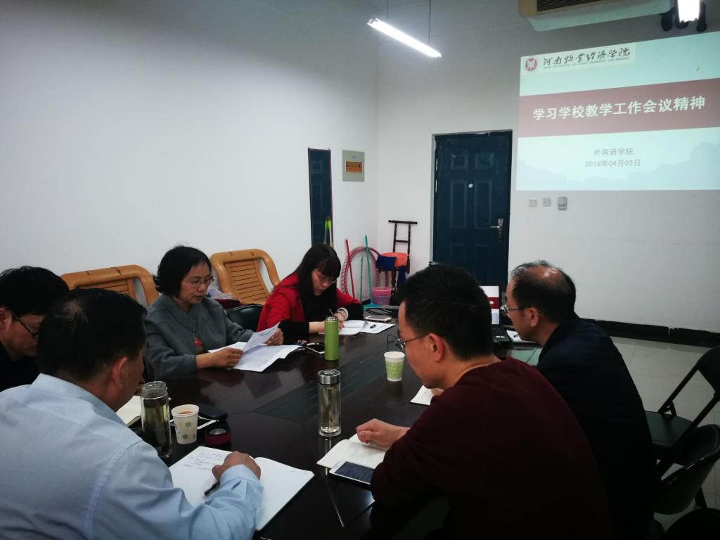 副院长许海兰分别从教学技能比赛、人才培养方案修订、教师业务能力提升等方面,汇报安排了近期的教学工作;副书记陈东景、副院长郑长发、副院长马媛媛分别从学风建设、科研、教研、师资队伍整合等方面对分管工作进行了汇报总结。会议研究通过了《伟德源自英国始于1946三级观摩课实施方案》,第九届全国高校外语教学大赛河南省赛、2018“外研之星”外语教师教学技能大赛推荐人选;会议就人才培养方案修订,考研英语辅导,新东方外语教学平台、Itest大学外语教学与测试系统、句酷批改网等外语教学资源共享,校企合作项目推进,外语文化月等工作进行了研讨并明确了责任人与推进方案。