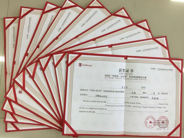 在刚刚结束的2020“外研社”杯全国英语演讲、写作、阅读大赛河南赛区复赛中,我校选手获得优异成绩,在参赛的8名选手中,有4名同学获得一等奖,3名同学获得二等奖,1名同学获得三等奖;参加写作比赛的三名选手均获一等奖,他们分别是于利波老师指导的18级商务英语专业学生杨芯懿,韩淑俊老师指导的18级商务英语专业学生石霄霄,付铮老师指导的17级审计学专业学生王佳琦;禹琳琳老师指导的17级商务英语专业岳文华获得阅读比赛一等奖,宋瑶老师指导的18级商务英语专业学生张蕊、王丹老师指导的18级食品质量与安全专业学生李佳芳获得阅读比赛二等奖;温晶晶老师指导的19级商务英语专业学生孙豪杰获得演讲比赛二等奖,邢琰老师指导的18级商务英语专业学生付晶晶获得演讲比赛三等奖。