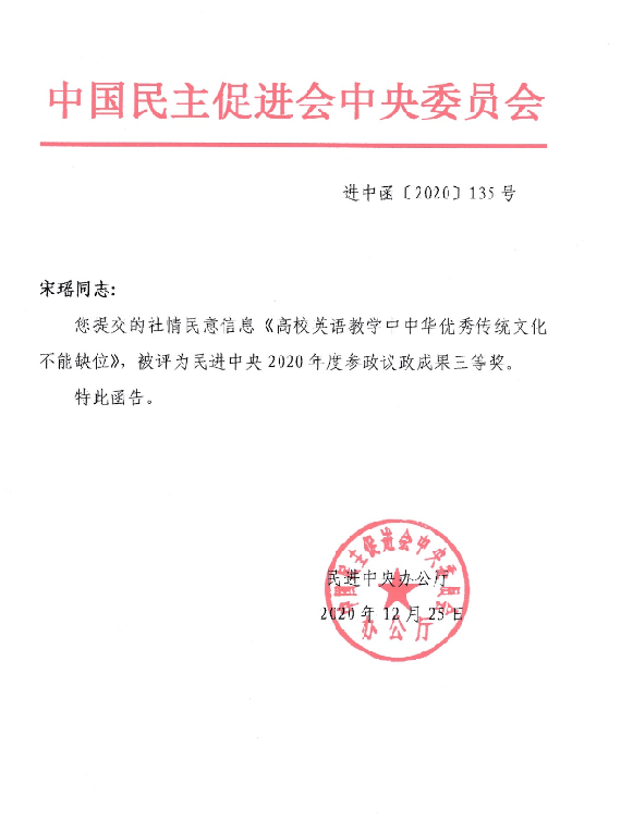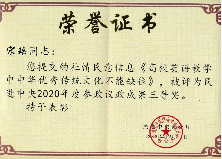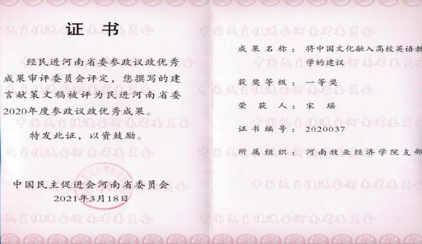 我校伟德源自英国始于1946教师宋瑶老师提交的社情民意信息《高校英语教学中中华优秀传统文化不能缺位》,喜获民进中央2020年度参政议政成果三等奖,宋瑶老师在此基础上撰写的建言献策文稿《将中国文化融入高校英语教学的建议》被评为民进河南省委2020年度参政议政优秀成果一等奖。