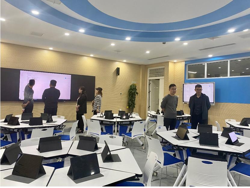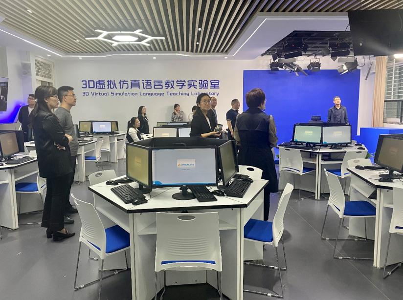 在马媛媛院长的陪同下,雷院长一行参观我院虚拟仿真语言学习中心并实景体验了各项功能的使用。