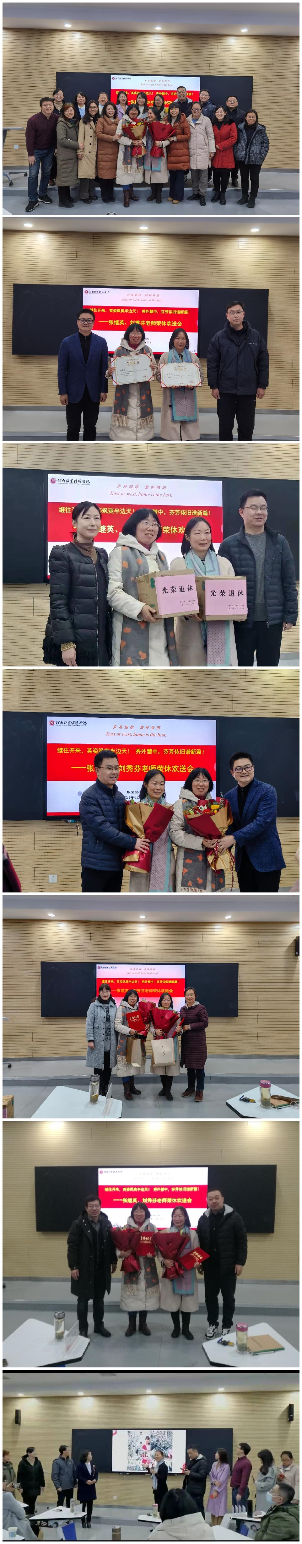 会上,柴华和胡先锋为两位老师颁发荣誉证书,学院副院长许海兰、马媛媛及青年教师代表向两位教师分别送上纪念品和鲜花祝福。两位老师深情回顾了自己的工作经历,真诚感谢学校及学院对他们的关心,并对全体在岗同仁提出了期许与勉励。“这张照片、猜猜看,她是谁?三十五年前...”张静、王伟老师带领教研室全体人员精心准备的感人节目在诗歌声中拉开帷幕。李巍、张明梅等老师深情献唱中英文歌曲《友谊地久天长》。此情此景,无不感动。节目最后,教研室老师们用最真挚的诗篇为两位老师送上最诚挚的祝福:“老骥伏枥志在千里,退休续谱夕阳曲。余生春暖再飞跃,友谊地久天长。”