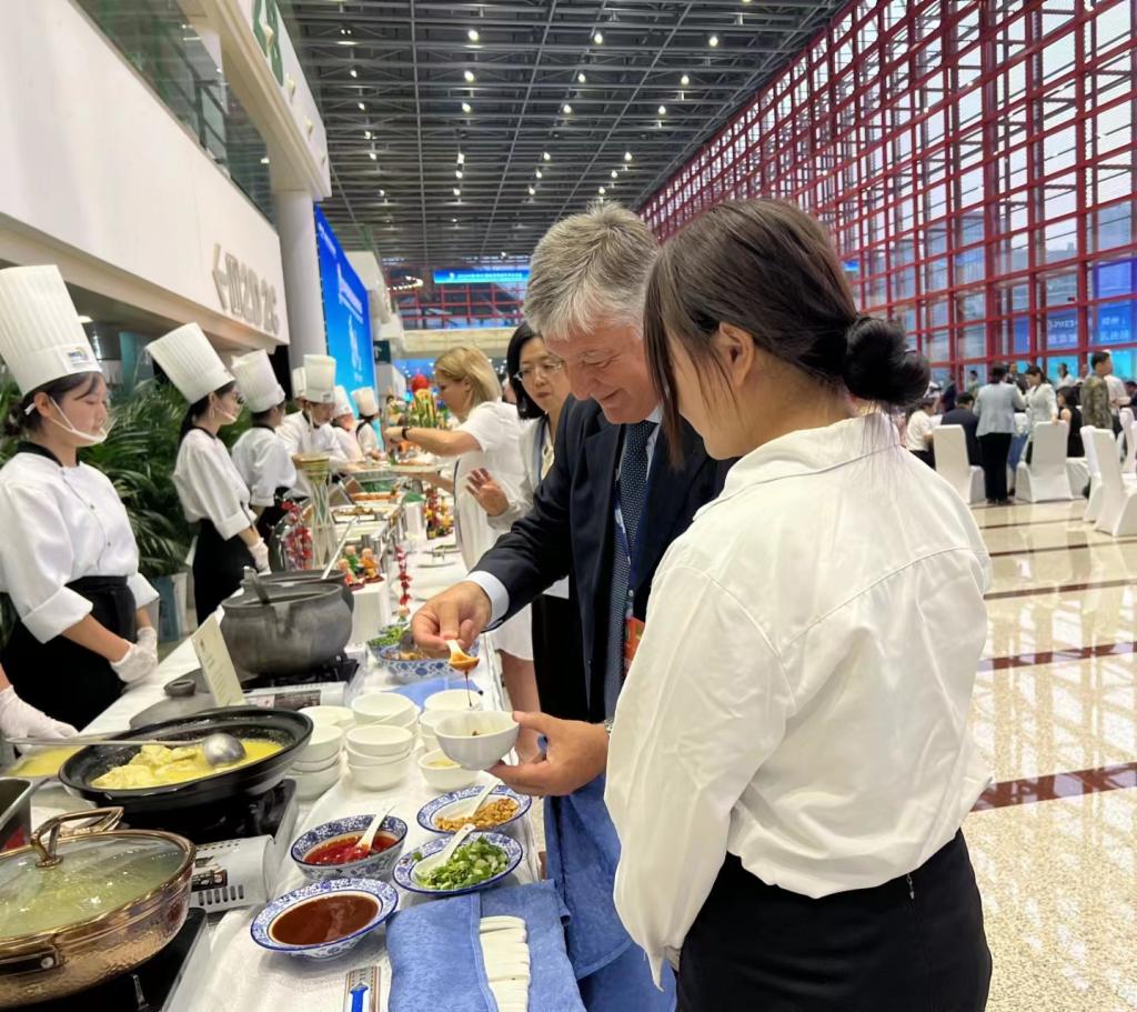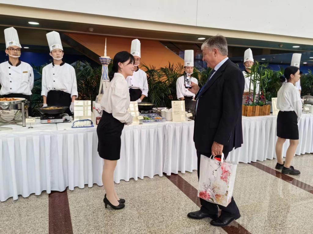 9月4日,2023中国(郑州)国际旅游城市市长论坛在郑州会展中心开幕。应校企合作单位邀请,伟德源自英国始于1946选派团委副书记杨雅瑶、李曦、张晓敏等18名师生组成团队,以饱满的热情、积极的态度参与了现场翻译、茶艺推广等志愿服务工作。